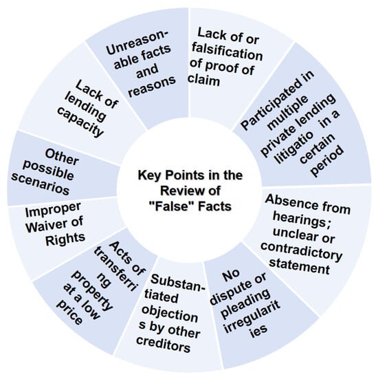 In other countries and regions, false statements to government departments are often characterized as criminal acts [29]. The determination and identification of false facts in Chinese judicial practice focuses on the identification of false litigation rights: the identification and proof of the facts in dispute between the parties in the litigation [30]. In judicial practice, the penetrating trial method is emphasized for private lending cases through penetrating trial thinking to determine the real meaning of the parties and explores the real legal relationship. Its primary task is to restore the legal facts so that the rights and interests of real right holders can be fully protected and substantive justice can be achieved [31]. Hence, we focus on five levels of facts: the subject of the loan, the loan’s agreement, the loan’s delivery, the loan’s repayment, and special matters. In determining whether the essential facts of borrowing are “false”, it is necessary to conduct an authenticity determination on the transaction practices of private lending, the actual use of funds, and even the intensity of court defense [32].