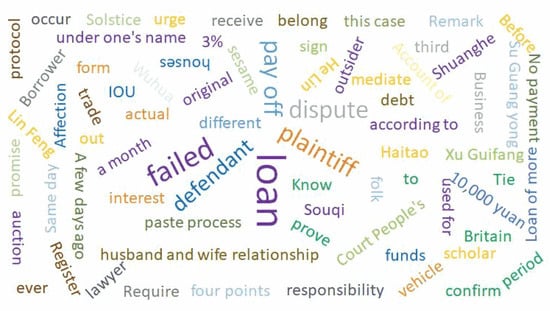 For the training test text, the vocabulary frequency is counted, and a word cloud map is created to present the importance and frequency of words in a visual way, which can intuitively highlight the keywords or famous words in the legal text and help in comprehending its main body and core content. As shown in Figure 6, the keywords highlighted in the text include plaintiff, defendant, borrowing, transferring cash payments, monthly interest, annual interest, etc. We adopted these keywords when testing traditional machine learning techniques that require the inputs of associated features.
