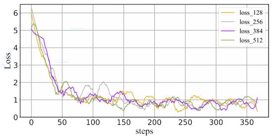 We analyzed the convergence speed of the loss function in the generation task at the end of training by examining the loss curves. The four curves in Figure 8 correspond to different lengths of the T5 loss-constrained text. We observed that the model’s loss decreased rapidly in the initial stages, stabilizing dynamically around the 100th step. However, it is worth noting that the loss of the generative model somewhat fluctuated, showing an overall downward trend and eventually converging to a fixed range. The loss curve trends of different lengths of text were similar, indicating that the model has a certain degree of robustness to the text length. Additionally, training could be terminated early at approximately the 200th step. Hence, we can consider ending the training early to prevent overfitting.