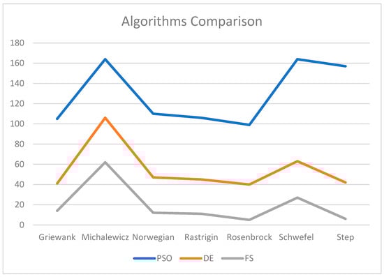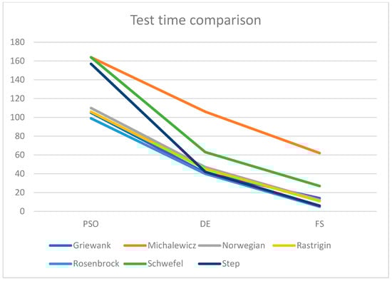 Figure 1 illustrates the time taken per test, while Figure 2 shows the time required by each algorithm to complete 100,000 iterations for a selected test case. Among the algorithms analysed, Particle Swarm Optimisation consistently required the most time across all tests. Differential Evolution exhibited a moderate range of time consumption, while the Free Search algorithm completed all tests the fastest. Notably, the results for the Schwefel and Step tests (Figure 2) suggest the presence of specific factors that may affect exploration time, indicating that certain features of these functions could be influencing the efficiency of the search process.