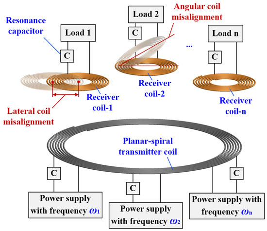 A traditional STMR-WPT system is shown in Figure 1, which includes a planar-spiral transmitter coil, multiple planar-spiral receiver coils, loads, resonance capacitors and independent power supplies with different frequencies.