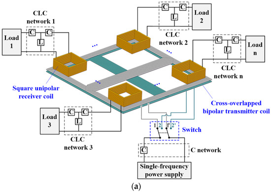 To overcome these limitations, this article proposes an improved STMR-WPT system structure. As shown in Figure 2a, it mainly includes a single-frequency power supply, a cross-overlapped bipolar transmitter coil, a switch, multiple square unipolar receiver coils, loads and C-CLCs networks.