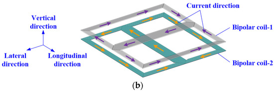 The cross-overlapped bipolar transmitter coil consists of two square bipolar coils, labeled as bipolar coil-1 and bipolar coil-2. The two bipolar coils are orthogonally overlapped together, as shown in Figure 2b. The square unipolar receiver coils are placed on one pole of the bipolar transmitter coil. The side length of the receiver coil is designed to be less than half of the side length of the transmitter coil.