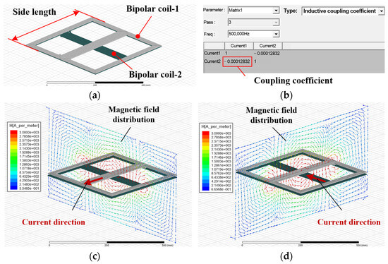 A simulation model is first established. As shown in Figure 3a, the cross-overlapped bipolar transmitter coil model consists of two square bipolar coils made of copper wire with a diameter of 2.8 mm. The side length of the bipolar coil is set to 400 mm, and the number of turns of the bipolar coil is eight. The excitation current and frequency are set to 100 A and 500 kHz, respectively. Because the two square bipolar coils are orthogonally overlapped together, the coupling coefficient between them is very small. Through simulation, it can be obtained that the value of the coupling coefficient is , as shown in Figure 3b. Therefore, the mutual inductance effect between the two bipolar coils can be ignored.