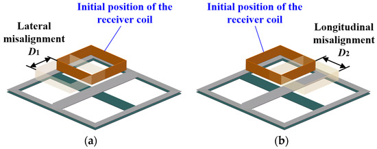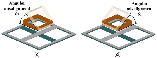 To simulate the lateral and longitudinal coil misalignments, the receiver coil is moved along the lateral or longitudinal direction, as shown in Figure 4a,b. To simulate the angular coil misalignment, the receiver coil is rotated around the lateral or longitudinal direction, as shown in Figure 4c,d. The coupling coefficients between the transmitter coil and the receiver coil under different coil misalignment conditions are analyzed.