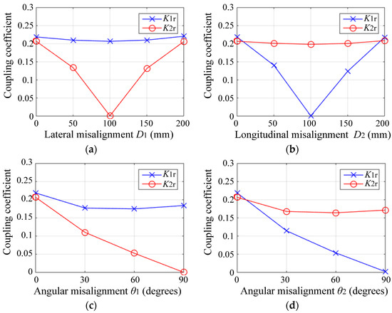 Measured coupling coefficient between the transmitter and receiver coils with (a) lateral coil misalignment D1; (b) longitudinal coil misalignment D2; (c) angular coil misalignment θ1; (d) angular coil misalignment θ2.