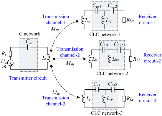 Wireless power transfer (WPT) technology using coupled magnetic resonance has become a research hotspot in recent years due to its high efficiency over medium distances, good flexibility and safety, and the ability to transfer power through non-magnetic materials [1,2]. The single-transmitter single-receiver (STSR) WPT system has been widely studied and successfully applied in fields such as wireless charging for portable devices [3], electric vehicles [4], underwater equipment [5], and implantable medical devices [6]. However, the STSR-WPT system still has some limitations, including that the coupling strength of the system is very sensitive to coil misalignments, and it cannot simultaneously transfer power to multiple load devices [7,8]. Therefore, WPT systems with multiple transmitters or receivers were developed by researchers.