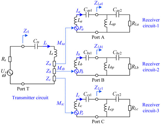 The STMR-WPT system includes three power transmission channels. In order to analyze the power flow of the system and obtain the transmission characteristics of each channel, the circuit model shown in Figure 6 is further equivalent to the mapping impedance-based circuit model shown in Figure 7, where , and represent the mapping impedances from the receiver circuit-1, receiver circuit-2 and receiver circuit-3 to the transmitter circuit. represents the current in the transmitter circuit. , and represent the currents in the receiver circuit-1, receiver circuit-2 and receiver circuit-3. is the source output power. , and are the power obtained by the receiver circuit-1, receiver circuit-2 and receiver circuit-3. The meanings of the other system parameters in Figure 7 are the same as those in Figure 6.