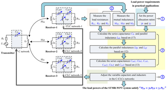 Based on the above analysis, when the power allocation conditions in (9) and the impedance matching conditions in (14) are satisfied simultaneously, the STMR-WPT system can achieve the expected power allocation goal while obtaining the maximum total PG. Therefore, a single-frequency power allocation method was proposed for the STMR-WPT system, as shown in Figure 8. The main steps include: