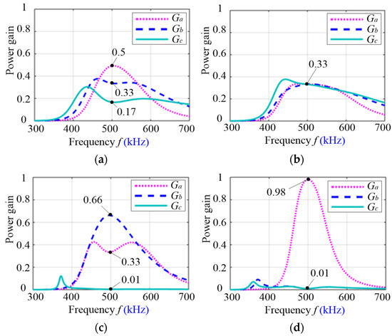 From (5) and (8), it can be seen that the load powers , and , and PGs , and are proportional to the real part of the mapping impedances , and . In addition, due to the fact that the total load power should be smaller than the maximum source output power, the total PG of the system is less than or equal to 1.