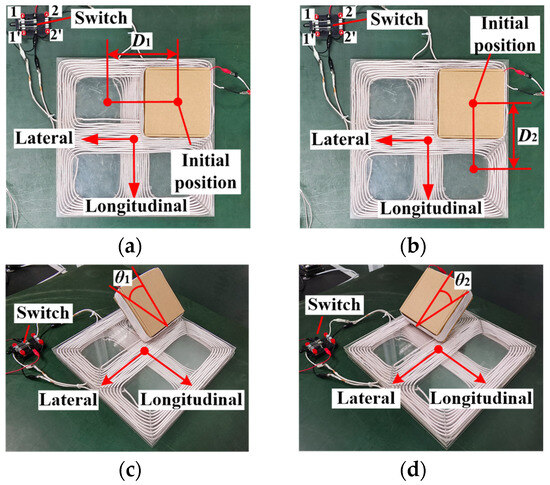 A switch was used to change the connection of the cross-overlapped bipolar transmitter coil. According to the analysis in Part A of Section 3, the magnetic field of the cross-overlapped bipolar transmitter coil can be adjusted to accommodate different coil misalignment conditions. When the switch is turned to the 1-1′ position, the bipolar coil-1 is connected to the transmitter circuit of the system, and the cross-overlapped bipolar transmitter coil can better adapt to the lateral misalignment and angular misalignment . When the switch is turned to the 2-2′ position, the bipolar coil-2 is connected to the transmitter circuit of the system, and the cross-overlapped bipolar transmitter coil can better adapt to the longitudinal misalignment and angular misalignment .