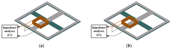 A high precision impedance analyzer Agilent 4294A was used to measure the mutual inductance between the transmitter and receiver coils. The measurement steps were as follows: Firstly, the transmitter and receiver coils were connected in series, as shown in Figure 12a. The total coil inductance () was measured using the impedance analyzer. Secondly, the transmitter and receiver coils were connected in series in the opposite direction, as shown in Figure 12b. The total coil inductance () was measured using the impedance analyzer. Thirdly, the mutual inductance between the coils () was calculated by: