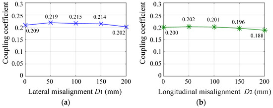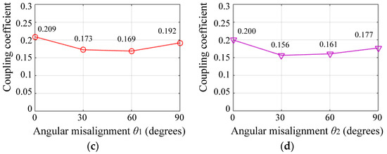 Figure 5a–d show the simulated coupling coefficients under the conditions of lateral misalignment , longitudinal misalignment , angular misalignment and angular misalignment , respectively, where is the simulated coupling coefficient between the bipolar coil-1 and the receiver coil, and is the simulated coupling coefficient between the bipolar coil-2 and the receiver coil.