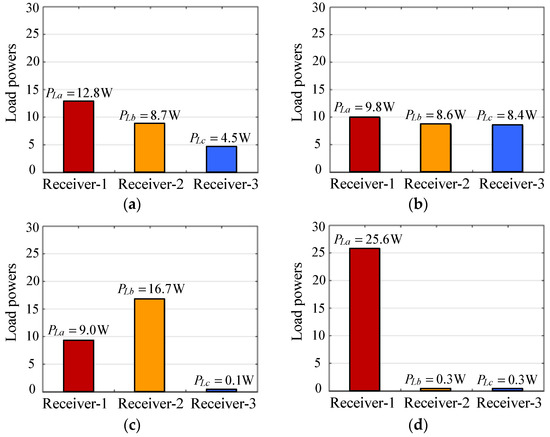 Figure 16a–d, respectively, show the load power distributions in scenarios-1, scenarios-2, scenarios-3 and scenarios-4. From Figure 16a, it can be seen that in scenario-1, the load powers of receiver-1, receiver-2 and receiver-3 are PLa = 12.8 W, PLb = 8.7 W and PLc = 4.5 W. The ratios of the load powers are PLa = 1.47PLb = 2.84PLc. It can be observed from Figure 16b that in scenario-2, the load powers are PLa = 9.8 W, PLb = 8.6 W and PLc = 8.4 W. The ratios of the load powers are PLa = 1.14PLb = 1.17PLc. Therefore, the three receivers obtain approximately the same load power in scenario-2.