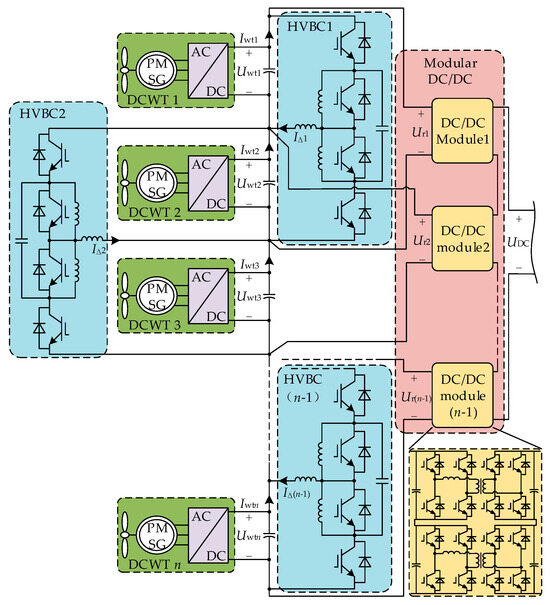 As shown in Figure 1, if we consider a series-connected wind farm consisting of n DCWTs, there should be n − 1 HVBCs. Additionally, the corresponding modular DC/DC system should have n − 1 DC/DC modules. Each HVBC contains four Insulated Gate Bipolar Transistors (IGBTs) with anti-parallel diodes. The input terminal voltage, Uri, of each DC/DC module is equal to the output terminal voltage of the HVBC connected in parallel with it, which is double the DCWT’s Uwti. The grid-side inverter controls the output terminal voltage, UDC, of the modular DC/DC converter.