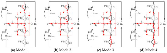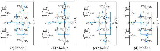 Taking the HVBC operating mode shown in Figure 5a as an example, the relationship between the power difference between two DCWTs and d can be analyzed. According to Kirchhoff’s Voltage Law (KVL),