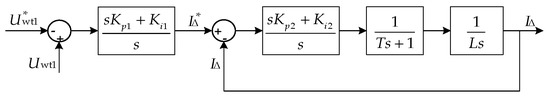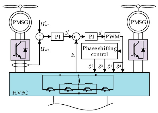 The HVBC decouples the power–current in series-type all-DC wind farms by supplying a compensation current to maintain voltage balance in the series-connected DCWTs. As the DC/DC converter regulates the voltage at the HVBC’s output, control must be applied to the output voltage of only one DCWT in each HVBC. The control object in the HVBC is the output terminal voltage Uwt of a DCWT. When Uwt exceeds the reference voltage Uwt*, the HVBC injects a compensating current into the series-type all-DC wind farm through L. Conversely, if the Uwt value of the DCWT is lower than Uwt*, the HVBC will extract a compensating current from the series-connected all-DC wind farm through L. The HVBC can be regulated using a closed-loop control approach, which comprises a voltage outer loop and a current inner loop. Thus, the optimal control approach for an HVBC should be a dual closed-loop system comprising an outer loop for voltage control and an inner loop for current control. This HVBC control strategy is depicted in Figure 8.