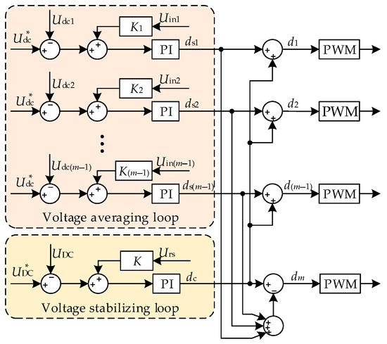 As a sub-module of the modular DC/DC converter, a dual active bridge isolation converter is utilized in considering the DCWT startup procedure and the isolation requirements. Equalizing each module’s output voltage and maintaining a steady input voltage are the control goals of the modular DC/DC converter. Owing to the variations in each module’s specifications, an imbalanced voltage output will result from each module’s control strategy adopting the same shift ratio. This will immediately impact the modular DC/DC converter’s stability. Therefore, equalization control must be added to each DAB module, and each DAB module’s shift ratio can be acquired by correcting this ratio [31,32].