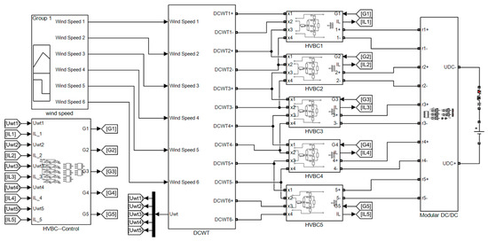 Excluding the measurement module, our Simulink consists of five main modules, i.e., the module for generating wind speed, the module for a series wind farm consisting of six DCWTs, the module for the HVBC, the control module for the HVBC, and the module for the modular DC/DC converter.