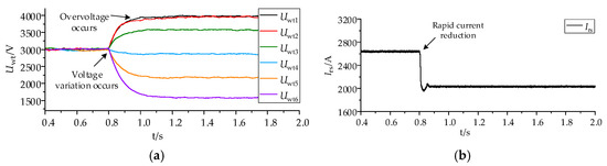 According to the simulated waveforms shown in Figure 14, the output voltage of the wind farm remains constant. This is due to the control exerted by the grid-connected inverter. At 0.8 s, the wind speed of the entire wind farm declines, reducing the electricity generated. Consequently, the output current of the series cluster is reduced from 2667 A to 2040 A. When the output current of a series cluster falls, the output voltage of some of the DCWTs in the cluster suddenly increases. This leads to a maximum overvoltage of approximately 1 kV, significantly impacting the safe and stable functioning of the wind farm.