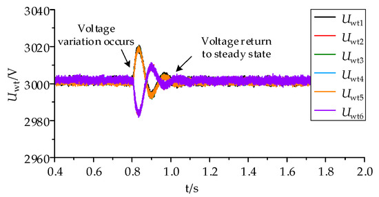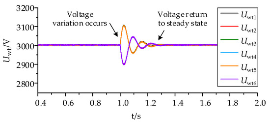 When a DCWT of a wind farm malfunctions or undergoes repair, it is necessary to deactivate the DCWT. Imagine that, one second ago, each DCWT was operating at its rated state, and after one second, DCWT2 was taken out of operation, owing to a fault. Currently, DCWT2 produces no output power, while the other DCWTs continue to output power at their rated levels. The simulated waveforms of the output voltage of each DCWT in the wind farm are depicted in Figure 19.