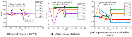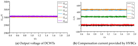 According to Figure 16b, the power differential can be estimated to be zero because DCWTs 1, 2, and 3 all function at their rated state. Consequently, the compensating currents and provided by the first two HVBCs can be maintained at a stable value close to 0. The power disparity between DCWT3 and DCWT4 is 0.8 MW. Based on Equation (5), it can be inferred that the compensation current is 267 A. The simulation results depicted in Figure 16b exhibit a high degree of proximity to the corresponding theoretical values. Furthermore, the compensation current generated by the fourth HVBC is nearly equivalent to the compensation current produced by the fifth HVBC, owing to the comparable power discrepancy between DCWTs 4 and 5, as well as between DCWTs 5 and 6. Examining the relationship between the output power of each DCWT and the compensation current confirms that the amount of compensation current is directly proportional to the ΔP value between the outputs of two adjacent DCWTs.