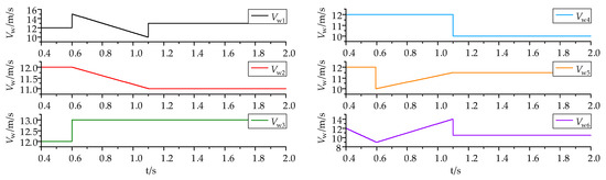 The wind speeds at the six DCWTs change within a time frame of 0.6 s to 1.1 s. After 1.1 s, the wind speeds at the specific positions of DCWT1 to DCWT6 reach a stable state, measuring 13 m/s, 11 m/s, 13 m/s, 10 m/s, 11.5 m/s, and 10.5 m/s, respectively. The operation during rapid wind speed change conditions is shown in Figure 18.