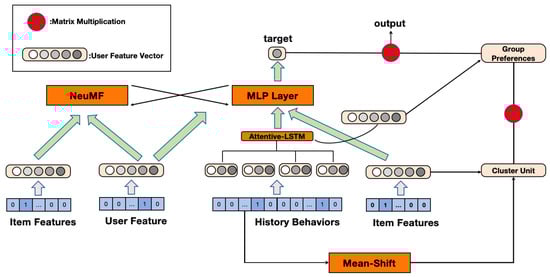 where denotes a multilayer perceptron that learns non-linear interactions among the input features, ‖ represents the concatenation operation, is the embedding representation from the Neural Matrix Factorization component, capturing collaborative filtering information between user u and item i, is the output from the Attentive-LSTM module, which models the temporal dynamics of the user’s historical behavior with an attention mechanism to highlight significant actions, and is the output from the Mean-Shift clustering component, representing the novelty and diversity by assessing the distance between the target item and the centers of clusters formed from recent user interactions.