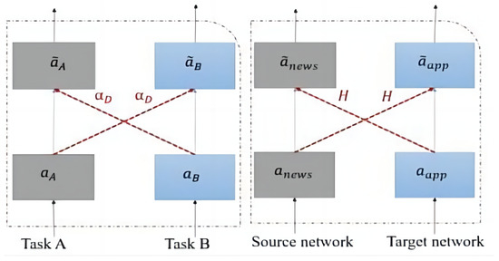 where and are the weight matrices of the I to hidden layer in the target and source domains, and are the input representations of the Ith hidden layer in the target and source domains, respectively, and are the bias entries of the Ith layer, and matrix is the knowledge migration matrix shared by the two models in the Ith layer, which corresponds to the linear projection of the cross-connections controlling the input information from the source domain to the target domain and vice versa.