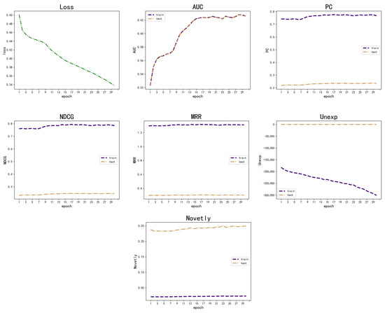 In Figure 3, the research model performs well in several metrics. In particular, the model demonstrated its efficiency and accuracy in processing news recommendations in terms of AUC and Precision–Recall. The model is noted for its significant performance improvement in the initial phase, with the performance growth stabilizing as training progresses.
