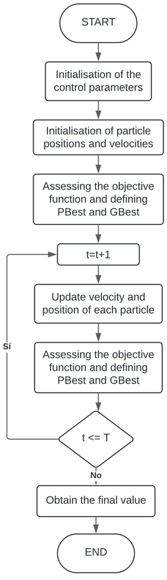 The PSO algorithm is one of the variants of evolutionary optimization algorithms, which is inspired by the behavior of swarms of animals, such as flocks or shoal, which exhibit intelligent collective behavior. This algorithm has several advantages in that it is able to deal with complex, high-dimensional problems. The general operation of the PSO is shown in Figure 2, by means of a flowchart, which consists of a group of particles (known as a swarm) navigating a multi-dimensional search space (called design space), where the position of each particle (PBest) depends on the design variables and each one represents a potential solution to the problem. During each iteration, the particles adjust their velocity and position by considering both their current and previous positions (GBest). Finally, the position of the optimal GBest is obtained by performing this process until the convergence condition given by a maximum number of iterations is met, carrying out a comparison between the maximum number of iterations (T) and the current iteration (t). This process allows each particle to be influenced by the entire set of particles in the swarm, with the goal of finding the best global position that optimizes the objective function, seeking both its maximum and minimum [28].