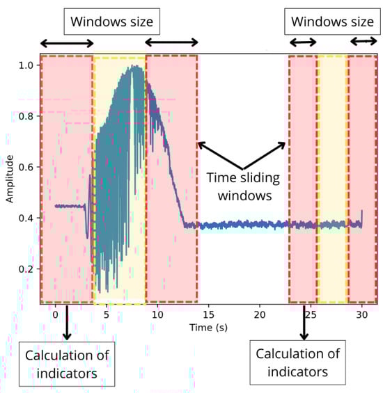 Short-time statistics are used to calculate the indicators shown in Table 1. In addition, Figure 3 shows an example of how to obtain the indicators proposed here. As shown there, it is a signal captured in the time domain, over which square sliding windows are generated with or without overlapping occurring between each one of them. The size of the windows is selected by the proposed optimization algorithm (PSO) in order to avoid as much as possible the processing of disturbances in the captured signal. Then, for each window created, the proposed indicators are calculated using the expressions (1) to (9). Finally, a new raw signal corresponding to the statistical analysis in a short time is obtained. This new raw signal will correspond to the statistical amplitude along the acquired signal in the full-time domain, including the start-up transient and the steady state. Likewise, for the calculation of the short-time variance, the same process is carried out concerning the segmentation of the windows and obtaining the number of windows of the particle optimization algorithm (PSO), with the difference that once the signal has been windowed only the variance in each of them is calculated. The input signal at this stage is the signal resulting from the process above (Shor-time statistics) and results in a new signal based on the variance.