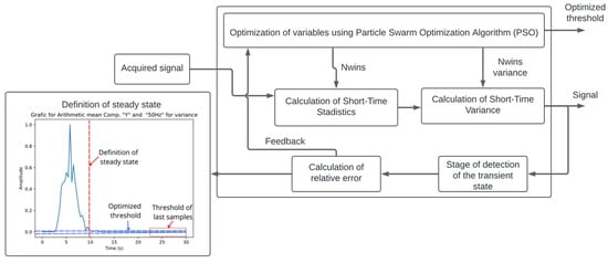 We have proposed the variance method to detect the point at which the steady state of magnetic stray flux signals begins. This algorithm performs a first-degree polynomial fit between several signal points (i.e., window size). It must be ensured that the number of samples used for the fit is manageable in order to avoid a significant reduction of the total sample size, which could lead to a loss of information. Another critical aspect of this methodology is the proposal of a threshold, which corresponds to the average value of the variances of the last 10% of the signal (this portion is considered to be in a steady state), as shown at the bottom of the flowchart in Figure 4 as the “threshold of last samples”. This percentage can differ for different IMs depending on different aspects, such as the connected load and power supply technology. To this end, the methodology employs a Particle Swarm Optimization (PSO) algorithm, which allows the optimal estimate of the window size to perform the calculation of statistical and non-statistical indicators (Nwins) in the first stage of the algorithm, the window size for the variance calculation (NwinsVariance), and a second threshold to discard a part of the signal noise that could result in false positives as shown in the second block of the flowchart in Figure 4. This approach allows for an optimal threshold that adjusts to the values of each analyzed signal, as seen in the last block of the flowchart in Figure 4 labeled “Optimized threshold”. Once the stationary value of the signal has been determined, each of the selected variance values is compared with the first threshold calculated in the previous step. The transition from the transient state to the steady state is identified by looking for the most significant difference between two consecutive indices that has coincided with the value obtained at the threshold mentioned above, which will correspond to the time that the steady state ends. This process is illustrated graphically in Figure 4. As an additional step, the relative error of each sample was calculated using Equation (10). The real value corresponds to the time value of the start-up ramp programmed in the frequency inverter to carry out the tests, while the approximate value is the value obtained by the proposed methodology.