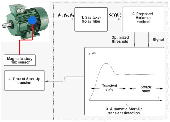 This part describes the proposed methodology, which is shown by a flow chart in Figure 5. In the first block, a normalization process is carried to the signals generated and stored by the data acquisition system (DAS): axial stray flux (), radial stray flux (), and axial+radial stray flux (). This normalization is performed by scaling the amplitude of the input signal to a range [−1, 1]. Then, a Savitzky-Golay type filtering is applied to this signal with a data window size of 49 points and order 5 for the filter’s polynomial approximation. These parameters are chosen due to the nature of the filter, which requires an odd window size and which is larger than the order to be used for the approximation. Once this process has been carried out, a pre-processed signal is obtained SG (), this signal will be the input of the next block, which is the proposed variance method (described in detail in the previous chapter). As explained above, the output of this block consists of a signal and an optimized threshold, which are used in the last block of automatic start-up detection explained below. The fourth block of the methodology corresponds to the detection of the transient state. For this purpose, a threshold (stable threshold) is established, which is obtained with the absolute value of the average of the last 10% of the total signal, since it is considered that at this point the signal is already in a stable state and will be used as a reference. In addition, the optimized threshold obtained in the previous block is used to overcome the noise peaks that may appear in the stable zone, as they can produce false positives and affect the start-up time detected by the methodology. Once the stable threshold has been obtained, this threshold is compared with each of the amplitudes of the signal resulting from the variance method. For those indices with a value lower than the threshold, a dashed line is drawn as a graphical reference only. Subsequently, once the entire signal has been compared, the most significant difference between two consecutive indices that has fulfilled the condition is sought, which will correspond to the time that the transient state lasts—allowing to find the point where the transient state ends and the steady state begins.