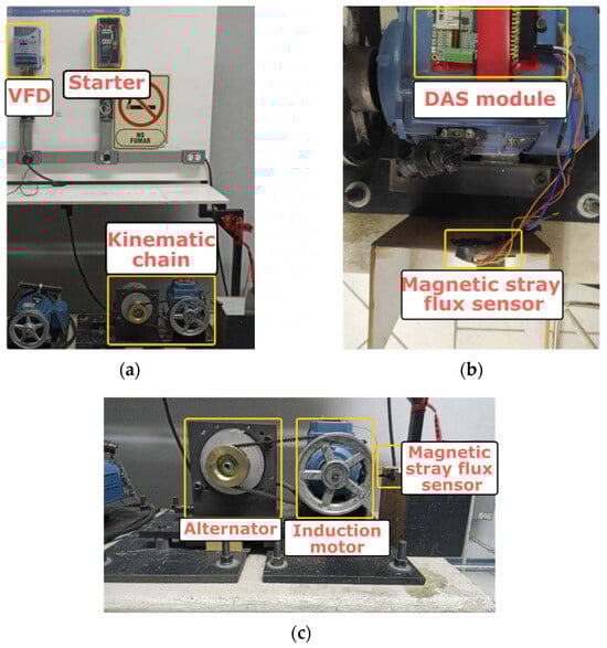Experimental setup: (a) kinematic chain and IM starters; (b) side view of the installed sensor; (c) front view of kinematic chain.