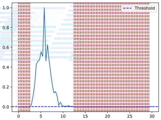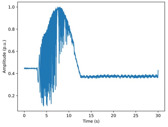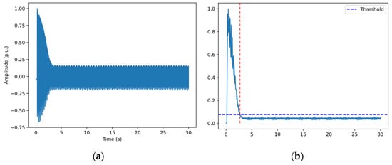 Next, Figure 10 shows the graph obtained at the end of the signal processing stage, where the short-time variance is applied to the signal previously shown from the calculation of the statistical and non-statistical indicators. This signal clearly shows the peaks of change that exist in the transient state. This is due to the variance calculation because as the amplitude of the variance tends to zero, it can be inferred that this corresponds to the steady state of the signal, while the segment with a more significant variance belongs to the transient state. Once these limits are defined, several vertical lines (shown in red in Figure 11) are drawn for observation and clarification purposes, indicating the points on the graph where there is no considerable change in variance and, therefore, it is considered a steady state. This allows the detection algorithm to focus on finding the part with a more negligible variance difference, which it selects as the definitive point at which the steady-state begins.