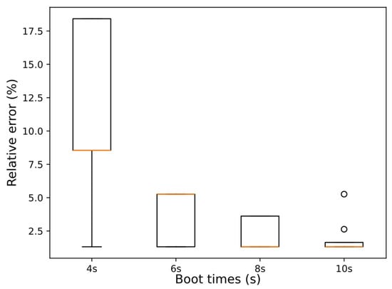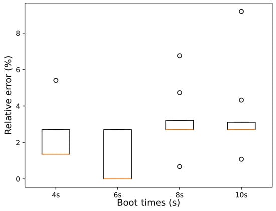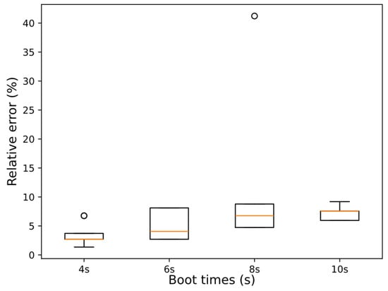 As final results, Figure 13 shows a box and whiskers plot, resulting from the calculation of the relative error obtained by completing the proposed methodology, calculating the error for each repetition of the four cases of study (4 s, 6 s, 8 s, and 10 s of start-up time), and for the power frequency of 45 Hz. This graph shows the analysis of variance (ANOVA) resulting from the eight repetitions for each start-up ramp used in the experimentation. It is noticeable the relatively low error percentages obtained, having an average of 2.7% error for the case of 4 s, 4.8% error for 6 s, 6.5% error for the case of 8 s, and 6.7% relative error for the 10 s start = up transient.