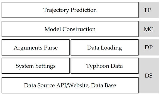 The DS obtains both system settings data and typhoon or meteorological datasets from different kinds of data providers, such as CMA, ECMWF, and ZMB. Different data providers provide datasets differently in terms of data types and data formats. In order to simplify the system’s processing of typhoon-related business data from heterogeneous data sources, we provide two basic data readings in the system, which are used to parse text files in CSV format and binary files in NCF, respectively. These files will be organized in advance and stored in the local file system according to a uniform naming convention and directory hierarchy. System settings data are required for the start of the system. The system provides default values of parameters for users to run and test quickly, and users can also specify other parameter values at runtime. On one hand, the DP is expected to read raw business data from the file system, converting them into data objects that meet the format requirements of the algorithm, and to prepare the input and expected output data in advance for the next model training and testing. On the other hand, the DP is also responsible for the parsing of system parameters such as the GPU device ids, the configuration file path, the data source file path, and so on. The purpose of the MC module is to build the neural network model according to the customized algorithm names and rules of net hidden layers, e.g., the number of input channels, the name of each layer, key parameters, etc. After the training and validation, the neural network model will be built with trained parameters for each model layer and all trained parameters will be stored. There is a parameter named “no training” in the system, the purpose of which is not to train, only to test. Once the model is built, we can only choose trajectory prediction without the model training stage by setting it to true. The TP is to execute the trajectory prediction using the trained model.