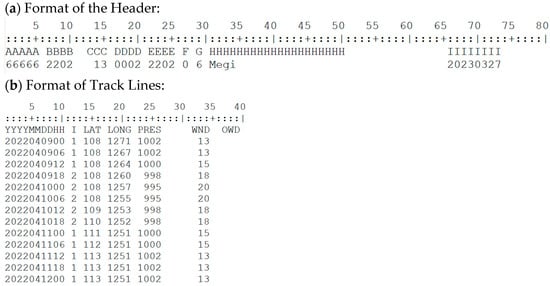 The main typhoon track datasets used in this study comes from the CMA, which has provided the datasets as text files every year since 1949 with the named format “CHYYYYBST.txt” [27,28]. The CMA Tropical Cyclone Best Track dataset covers the Northwest Pacific Ocean, including the South China Sea, north of the equator and west of 180° E. The track location is recorded every 6 h; however, since 2017, the recording frequency of typhoons landing in China has increased to every 3 h in the 24 h before the typhoon landing. Furthermore, a time frame of every 3 h extends the entire typhoon activity after its landfall. In order to unify the frequency of data collection, this paper adopts all the data of one line every 6 h, and ignores other lines of data collected every 3 h. The recording of each typhoon begins with a typhoon head row data, followed by multiple track lines closely arranged in chronological order, which record the typhoon’s moving path in detail. Taking the first typhoon “Megi” in 2022 as an example, Figure 2 shows the format of the header and track lines. The header always begins with the classification flag “66666”, which indicates the best path data. From track data lines, we can extract seven feature values for the location passed by each typhoon.