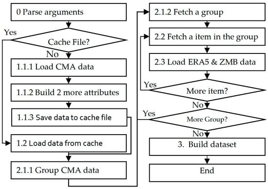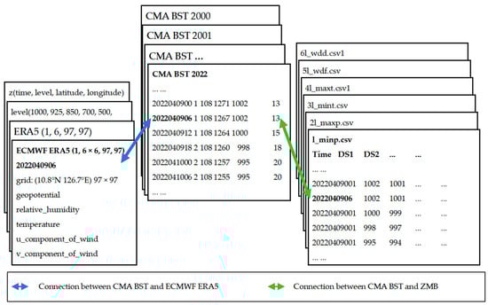 In this study, all meteorological information is saved in files. ERA5 data are stored in the form of binary files, which covers the largest amount of data, accounting for about 12.0 GB of storage space. There are 19,045 NCF files in total, and each file is stored in a two-layer structure directory, with the upper layer of the parent directory named after the year and the lower layer of the subdirectory named after the typhoon number. For example, a relative full file path “2022/20220002/2022040906_108_1267.nc” contains the relevant meteorological data around the track point of the 2022 typhoon number “20220002” passing through the latitude 10.8° N and the longitude 126.7° E at 06:00 on 9 April 2022. The data of ZMB and CMA are stored as csv files in the configuration folder.
