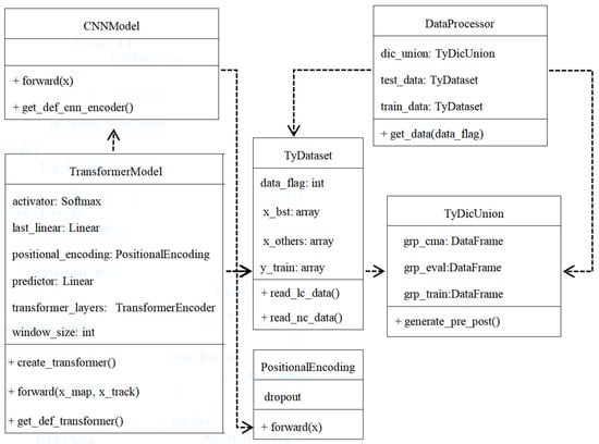 The DataProcessor is the only class that can be used externally (i.e., the interface class directly accessed by the programmer), and its instance “dp” can be generated by the system. The “dp” instance generates a TyDicUnion instance and multiplies TyDataset instances based on it. For instance, one TyDataset instance is for training, and the other is for testing, which can be obtained by the public function get_data within “dp” by passing different values for the parameter data_flag, either 0 for train or 1 for test, separately. The data model classes consist of both the encoding layer and the second core layer after encoding, such as CNNModel and PositionalEncodingModel, and the model TransformerModel after encoding. For different models, the class of Transformer can be replaced with other models, such as LSTM, Path-TST and so on. The process of model creation is actually a process of finding the best model through training, and the loss function results of the validation set are evaluated after each epoch to find the optimal model with the minimum loss value. In this study, mean square error (MSE) is used, since MSE has a clear mathematical expression and is relatively simple in mathematical processing, which is not only convenient for calculation and solutions, but also sensitive to outliers in the data. In addition to MSE, we also tried the distance between the real location and the prediction location.
