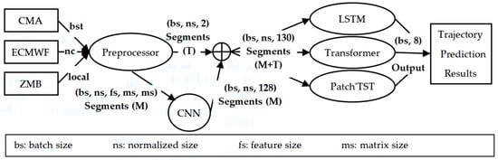 In this paper, the following three data sources are used: CMA, ECMW and ZMB; the first two are public and the latter is confidential. In terms of time, we mainly focus on the moments when the best track point of the typhoon was recorded by CMA, each of which is an integer multiple of 6, such as 0, 6, 12, 18, every typhoon day. From the perspective of spatial points, we focus on the surrounding spatial grid centered on the coordinate point of the best trajectory of the typhoon, and the location of the local acquisition stations in Zhuhai. The former changes with the typhoon track and represents a dynamic spatial coordinate point, while the latter does not change with the typhoon track and is a static point. When all data are fed into the system, a prediction of the future latitude and longitude is made. Only 6, 12, 18 and 24 h in the future are considered in this study, so predictions always contain four future points. Only typhoons with a certain number of trajectory points can be correctly identified, and the total number includes the input points and expected output points, e.g., a minimum limit of eight points, where the first four points are input and the last four points are output. The quantity limit varies with the input length and the prediction time range, which form a segment together. From a time point of view, we mainly focus on the moments when the best track points of the typhoon were recorded by CMA.