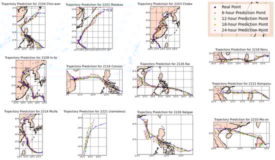 For each scenario, we also plot its true trajectory points and prediction points on the map of each typhoon, as shown in Figure 10, which is the map of the 12 typhoons in 2021 and 2022 after CNN+LSTM, scenario 12.