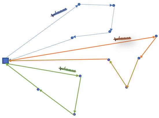 The task allocation for multiple AUVs under energy constraints in an underwater search environment is modeled as a Capacitated Vehicle Routing Problem (CVRP). As illustrated in Figure 2, three AUVs, each with varying power energy capacities, must ensure sufficient power for their assigned task nodes. The limited energy capacity of each AUV restricts the number of task nodes it can serve. This energy constraint also prevents highly capable AUVs from completing all task nodes in a single mission.
