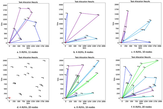 The AUVs have different power capacities, and the task nodes require specific amounts of energy for execution. We simulated six scenarios, as illustrated in Figure 3. From the results of the task allocation, Figure 3a—three AUVs and eleven task nodes, Figure 3b—four AUVs and eight task nodes, Figure 3c—four AUVs and ten task nodes, Figure 3e—eight AUVs and sixteen task nodes, and Figure 3f—eight AUVs and twenty task nodes achieved optimal task allocation within 10 s. However, Figure 3d—four AUVs and twenty task nodes did not yield a feasible solution as it failed to meet the energy requirements of all the task nodes, suggesting the need to increase the number of AUVs.