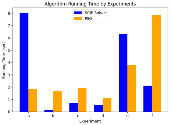 The following Figure 5 presents a comparison of the computational time for both algorithms across the same set of problem instances. As shown in Figure 5, PSO has an advantage in terms of the computational time, especially for smaller problem instances. Importantly, for most of the problem instances, the SCIP-solver-based algorithm solves the problems in less than 10 s, demonstrating that it is practical for real-world applications. In half of the instances, the SCIP solver completes the task in less than 1 s, further emphasizing its computational efficiency.