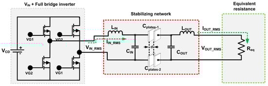 To achieve a stable coupling between the inverter and the load, a double-sided LC stabilizing network is used. Its design is based on the maximum power transfer, considering a voltage gain (|GVT|) and current gain (|GIT|) close to unity. To stabilize the network first, the low value of the coupling capacitances needs to be compensated so that the system can operate in resonance; secondly, the stability of the system must be maintained in case of variations in the value of the coupling capacitor, caused by changes in the distance between the plates. The complete circuit used for the capacitive wireless transmitter and the main blocks that form the transmitter proposal are shown in Figure 1, where the equivalent load models the rectification, filtering, and output load stage.