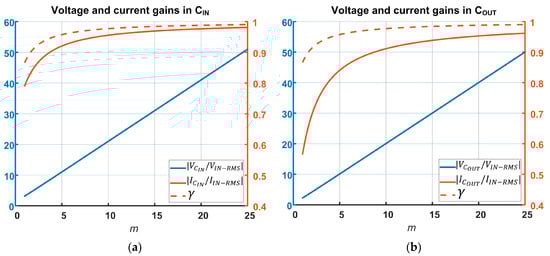 Voltage and current gain behavior in resonant capacitors: (a) in CIN capacitor and (b) in COUT capacitor.