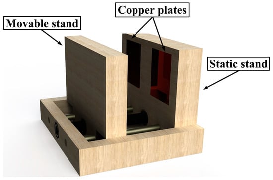 The copper plates are placed in a structure whose design allows for distance adjustment between them to validate the operation of the CPT system with changes in the value of the coupling capacitor. A 3D CAD rendering of the structure design is shown in Figure 4.