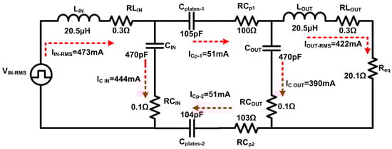 Figure 6 also shows the values of the current flowing through the different elements, as obtained from the simulation. It can be observed that despite the considerable values of and , the associated losses within the circuit are minimal due to the relatively low current flow through the coupling capacitances, which is less than and .